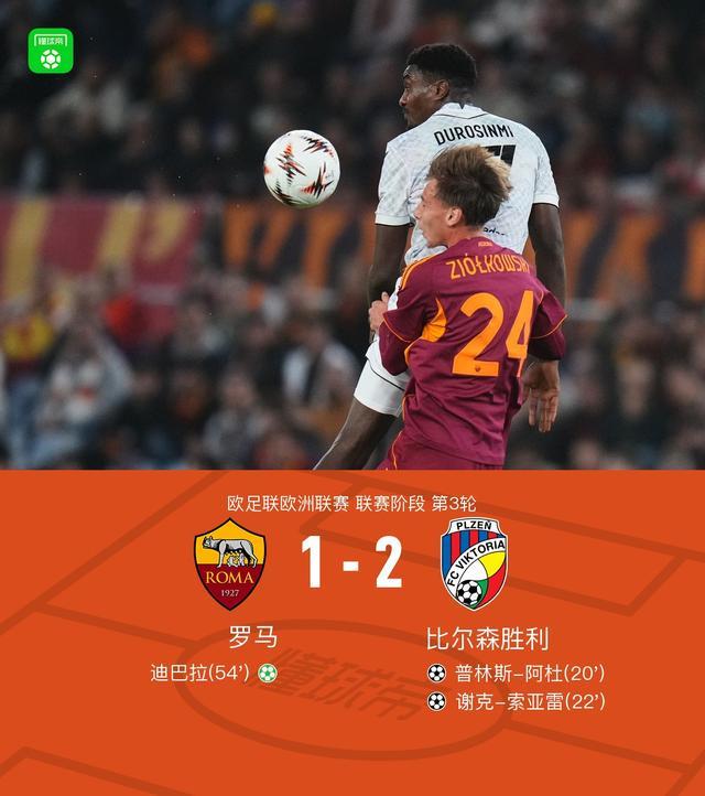 北京时间10月24日开始,欧国联阶段第三轮比赛开始。罗马面临比尔森的胜利。比赛一开始,比尔森胜利就率先打破僵局。杰德利卡送出帮助,阿杜王子推射成功。仅仅两分钟后,杜威的精准传球帮助切克·索亚雷再入制胜球,客场扩大了领先优势。易边再战,罗马获得迪巴拉主罚点球,为球队再下一城。此后双方均未能改变比分,全场比赛最终罗马1-2不敌比尔森。主赛事第20分钟,阿杜左路突破,禁区内小角度破门。比尔森以 1-0 获胜。第22分钟,苏亚雷外围远射将球扩大。比尔森以 2-0 获胜。第54分钟,耶梅尔卡送点,迪巴拉主罚点球。罗马1-2比尔森获胜。第8分钟,双方球员上场。第8分钟,Ch.埃尔夫从右侧将球传到球门后面。阿杜进来抽射偏出。第20分钟,阿杜左路突入禁区小角度破门。比尔森队以 1-0 获胜。第22分钟,苏亚雷外围远射扩大比分。比尔森队以 2-0 获胜。第54分钟,梅尔卡送点,迪巴拉主罚点球,罗马1-2获胜。第65分钟,聚勒禁区前绕圈射门,皮球偏出球门。第85分钟,莱昂·贝利禁区外尝试远射,皮球稍稍偏出。第90+6分钟,利马传球到门后,搭档越位进球被判无效。球队阵容 技术统计